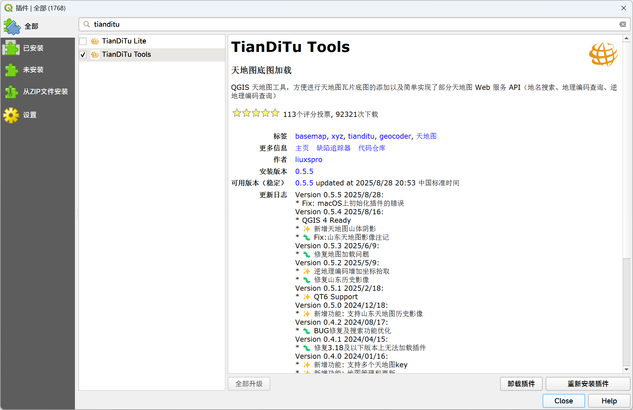 在 QGIS 插件库中搜索tianditu,点击安装即可。
